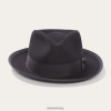A whippet fedora szilárd felületből, szőrmefilcből készült, és egy csipetnyi elülső koronával, kötött szélű karimával, belső marhabőr verejtékpánttal és grosgrain kalappánttal rendelkezik tollas díszítéssel.