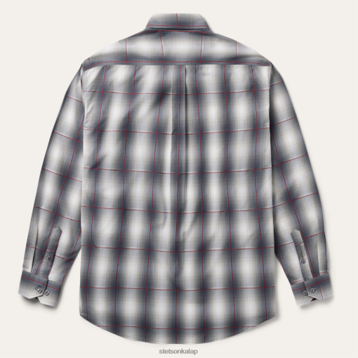 ezt a gombos inget festett, szatén csíkos füst ombre kockás fonalból készítik. egy egyenes háttámlával, redős és hármas tűvarrással, a bal elülső zsebében dombornyomott stetson ”s” logóval, a jobb ujjú zseton pedig dombornyomott ”stetson” logóval rendelkezik. kontrasztos belső szegéllyel és két gombbal állítható gérre vágott mandzsettával rendelkezik. a klasszikus gombelőlap gyöngyház logós gombokkal van befejezve, és 100% pamutból készült a minőség és a légáteresztő képesség érdekében.