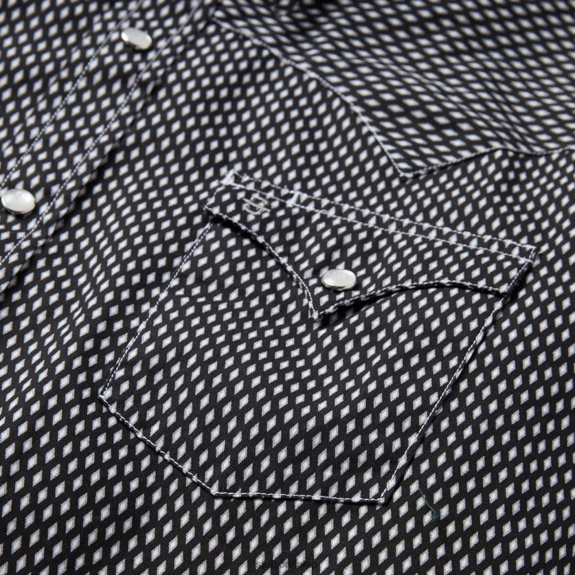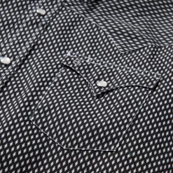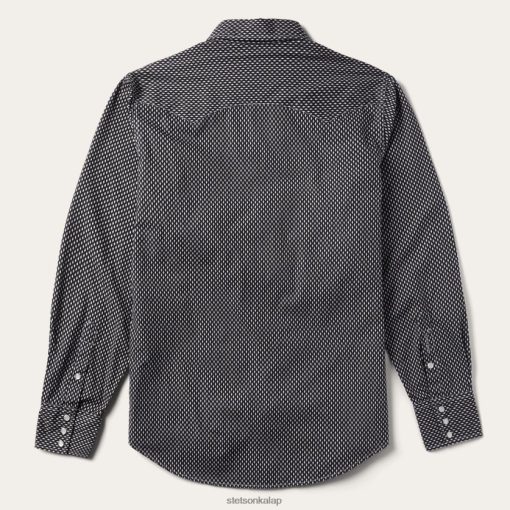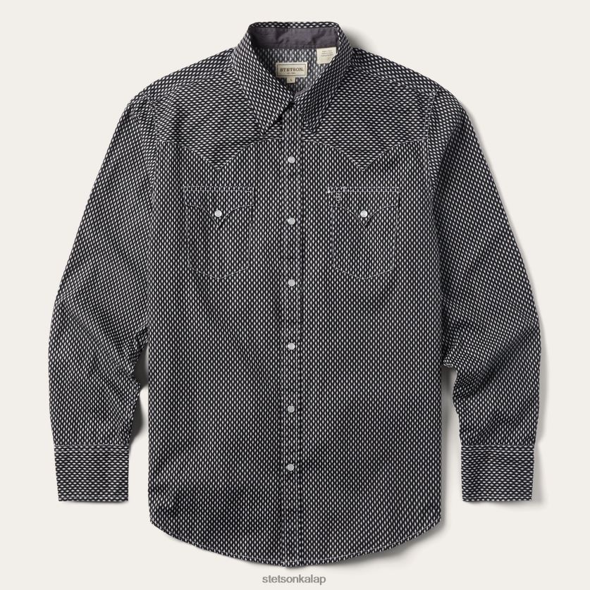 ez a nyugati ing ropogós, 100% pamut poplinból készült, és merész geometrikus fekete gyémántmintával rendelkezik. a klasszikus elülső pattintható stílusban kétpontos hátsó járom, két elülső zseb található egy pontra ívelt zsebszárnyakkal és három patentos mandzsetta. további részletek közé tartozik a gyöngy logó pattintása. kontrasztos díszítés, a stetson ”s” dombornyomású a bal elülső zsebében, és a stetson dombornyomás a jobb ujjon. vágott díszítés, a modern illeszkedésért.