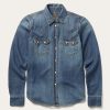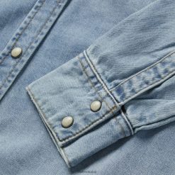 ez a klasszikus nyugati stílusú farmerblúz 100% pamutból készült, és laza szabással rendelkezik a kényelem és a mozgás szabadsága érdekében. két elülső zsebbel rendelkezik, fűrészfogas pattintással záródó szárnyakkal, mély v egypontos elülső kapcsokkal és egy ívelt, egypontos hátsó övvel, amelynek varrása lenyúlik az ujjakon a mandzsettákig. A további autentikus részletek közé tartozik az arany kontrasztos felső varrás és az ingfarkú alsó szegély.