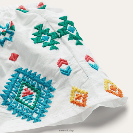 Színes, könnyű és sokoldalú, ez a fehér pamut gyepfedő élénk piros, sárga és türkiz fényes schiffli dizájnnal van hímezve. a stílusos, válltól eltérő kialakítást a nyakkivágás felső részén elasztikus szalag zárja a biztonságos és kényelmes illeszkedés érdekében. sima, 100%-ban kiváló minőségű fehér pamut gyepszövetből készült, ez a könnyű, nyugati ihletésű felső ideális minden meleg időjárási összejövetelhez.