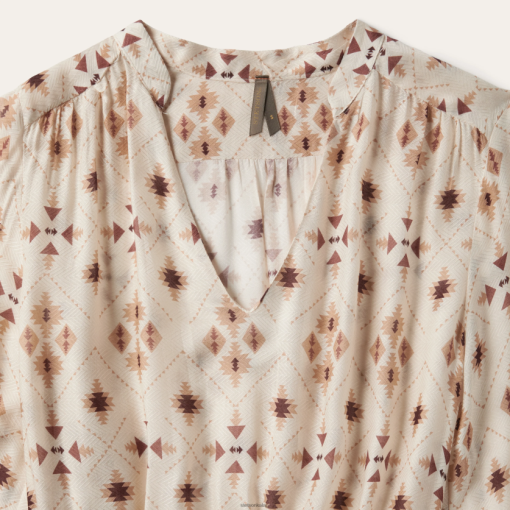 ez a középhosszú, cipzáras ruha 100% műselyem halszálkából készült, és mindenütt nyugati ihletésű gaucho szegélymintával rendelkezik. 3/4-es ujjú, rugalmas mandzsettával, állógallérja V-kivágással, egyenes hátrésszel, alul ráncokkal, elasztikus derékkal és oldalsó varrászsebekkel.