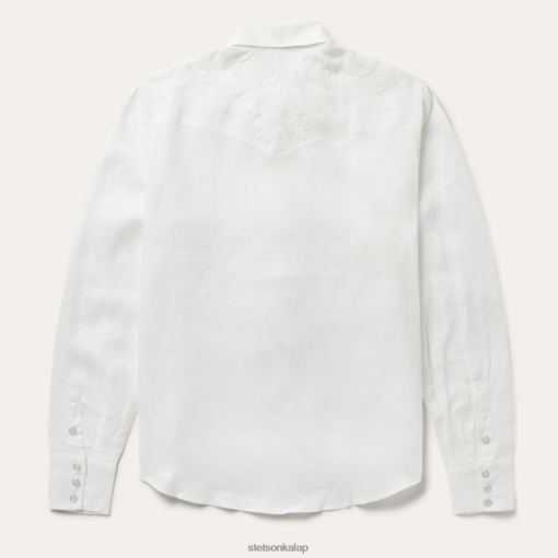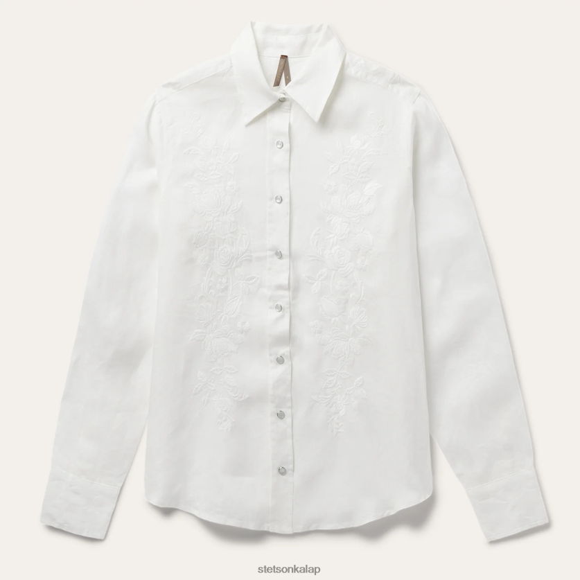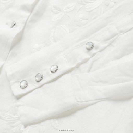 ez a gyönyörű fehér színű csíkos vászonblúz ropogós, hűvös, 100%-os vászonból készült, és bonyolult tónusú hímzett virágos részlettel rendelkezik, amely kiemeli a klasszikus nyugati ihletésű stílust. A kortárs sziluettet leengedett váll és egyenes hátrésszel jellemzi, redővel, egygombos mandzsettával és ívelt szegéllyel. Könnyű és légáteresztő, ennek a blúznak könnyű eleganciája van, amely tökéletes a meleg időjárási mindennapi viselethez.