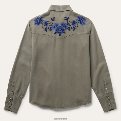 ez a nyugati stílusú, fiúbarát blúz tartós, 100% lyocell farmer twillből készült, amelyet gazdag olíva tónusra festettek. lenyűgöző sötétkék és búzavirág hímzésű virágos részlet található a hagyományos nyugati stílusú egypontos ívelt elülső és hátsó járomokon. műzsebszárnyak, klasszikus pattintható elülső záródás és öncsövek teszik teljessé ezt az egyedi, stílusos felsőt.