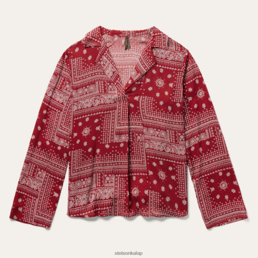 ez a pulóver blúz puha, sima, 100%-os műselyemből készült, és nyugati ihletésű, vörös pólya patchwork mintával. hízelgő, rovátkolt gallérral, V-nyakkal és hosszú ujjakkal rendelkezik, enyhe csengővel. a középső elülső nagy redő karcsúsító hatást kelt, míg a laza szabás és a könnyű anyag egész napos kényelmet és mozgásszabadságot biztosít.